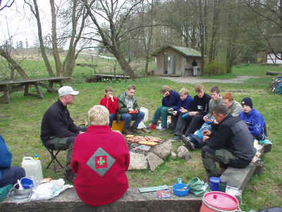 Lørdag: Den nye dag er oprandt, og der bliver spist en hurtig omgang morgenmad, og så af sted til åen. Vi har desværre ikke haft vejrguderne på vores side, da det har vist sig at blive køligt og blæsende hele weekenden, men er vi spejdere eller ej? Dette spørgsmål kunne ingen af os svarer på, men vi blev enige om at det er man vist, hvis man bruger en hel weekend på at sejle i kano i skodvejr. Det helt store spørgsmål var stadig om vi kunne krydse den foreliggende sø i sikker stil, da vejret stadig var noget uregelmæssigt. Det viste sig heldigvis ikke at være noget problem med en hel flok af ”stærke”, og ”styrer sikre” spejdere. Der blev holdt en kort pause med frokost, og tilhørende hvil (hvilket jeg er sikker på at mange var glade for). Efter ca. 8 timers sejlads nåede vi til vores udpegede overnatningssted, selvom vi var lidt uenige om det var det rigtige sted. Så blev der slået telt op, vasket kanoer, og nogen startede på maden. Menuen stod på grillede svendepølser m. grillede pølse- brød. Dette var et måltid mange var glade for, selvom jeg tvivler lidt på dets kulinariske værdi. Resten af aftenen stod det på hygge om et ny anskaffet lejrbål, og andre sociale ting. Som eks. aftentur på åen hvilket de tre store drenge: Jakob, Niels og Morten benyttede sig af. |