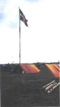 Vores telte og Dannebrog. Efter lang tids kamp lykkedes det endelige at få den største flagstang i underlejren. Det krævede også (som det kan ses) at 3 rafter var bundet sammen da udvalget af rafter var meget lille (sjovt netop i Sverige hvor de har så mange grantræer). |