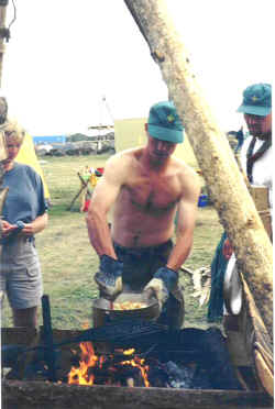 Madlavning. Gammelmands ild og spisebord sammenbygget. Det gav dog visse problemer da det blæste kraftigt det meste af tiden, men vi havde ikke så mange rafter at gøre godt med. |