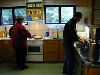 I køkkenet er der travlhed. Selvom juniorer og spejdere selv laver mad over bål, så skal maden fordeles og ulvene (og senere bæverne) skal have maden lavet.