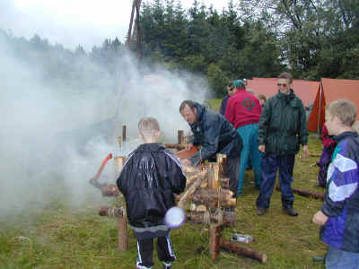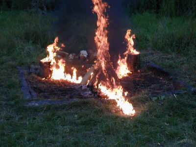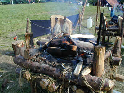 Et lejrbål antændt med "special effects". Optændingen er udformet som en tveje (vandrestav) med 2 finske komfurer i baggrunden som fakler. Det kan dog ikke anbefales i tørkeperioder.