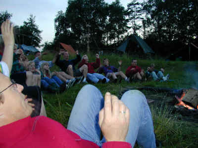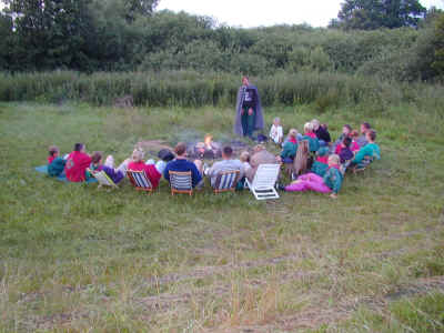 Samlet om lejrbålet udenfor.