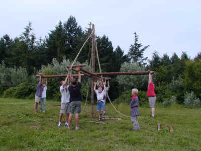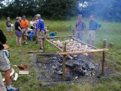 Så skal gryden over bålet. I dette tilfælde er bålet hævet op over jorden og hedder så en "gammel mands ild" (så behøver man nemlig ikke bukke sig).