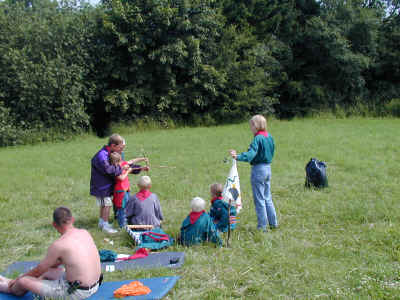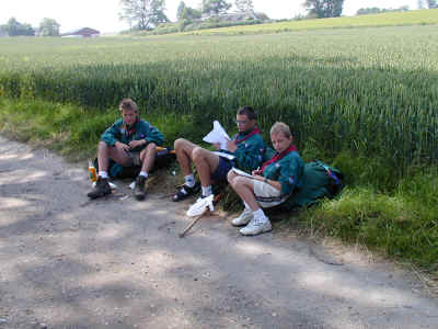 Sådan en hike midt i juli måned kan godt være varm. Spejderpatruljen her tager sig et hvil mens de nærstuderer kortet. "Hvor skal vi hen nu ?"