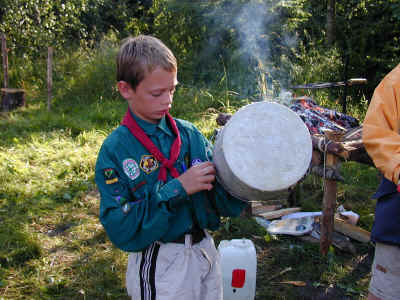 Inden gryden kommer på bålet bliver den fedtet ind i brun sæbe. Det gør det meget nemmere at rengøre den bagefter. Alt det sorte kan så fjernes med en renslet.