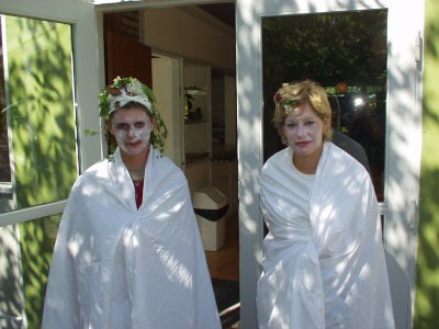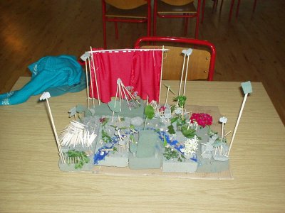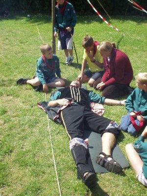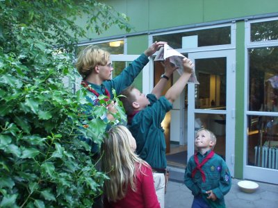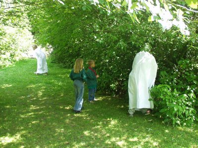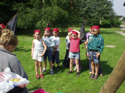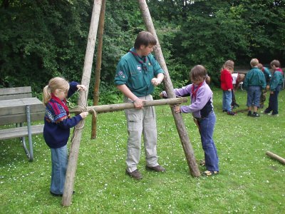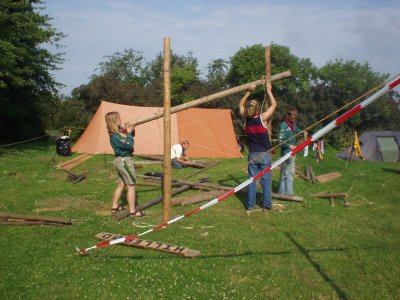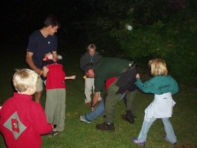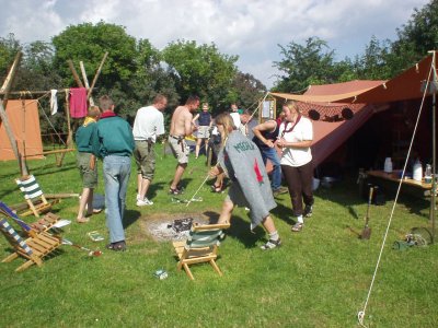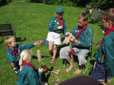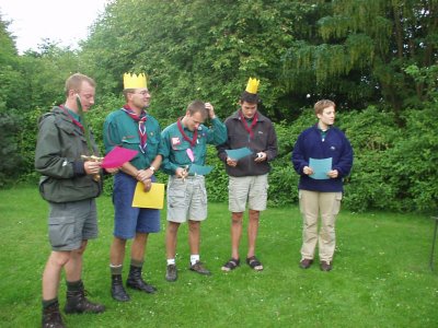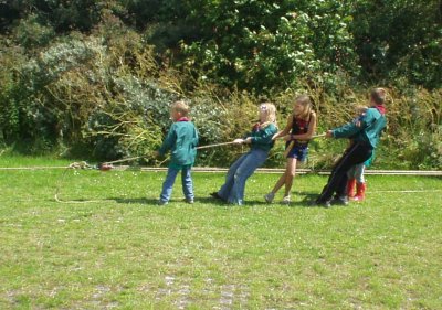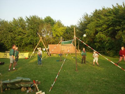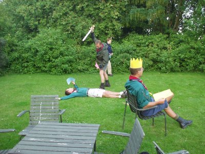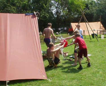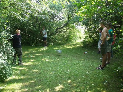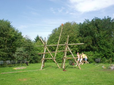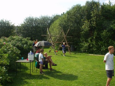 Juniortroppen lavede kastemaskiner, som skulle kaste med vandballoner. Derfor var fotografen klogeligt gået i skjul under en paraply.