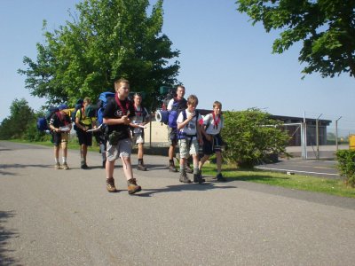 Juniortroppen på vej. De medbringer selv soveposer og liggeunderlag, da natten skal tilbringes i bivuak.